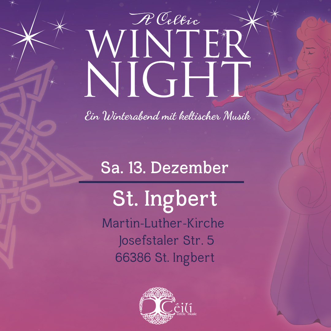 In diesen magischen Momenten erklingen Lieder aus dem keltischen Sprachraum, die von Freude und Leid, von Liebe, Hoffnung und Glaube erzählen. Seit 2016 ist die „ A Celtic Winter Night“ Reihe ein fester Höhepunkt im Konzertjahr von Céilí. Die Formation, bestehend aus Steffen Korf (Gesang, Gitarre, Bodhrán), Cornelia Lojer (Gesang, Flöten, Concertina, Percussions), Astrid Schamber (Geige) und Klaus Stocker (Gitarren) entführt ihr Publikum in wunderschönen Kirchen in eine Welt voller Zauber und Emotionen.Jedes Jahr präsentiert Céilí ein Programm aus Liedern und Instrumentalstücken, gespielt mit Gitarren, Flöten, Geige und der irischen Trommel.