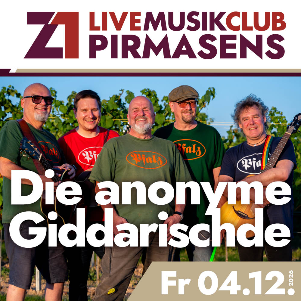 Jetzt kommen „Die anonyme Giddarischde“ nach fast drei Jahren Pause wieder ins Z1 mit ihrer Hingabe zur Pfälzer Sprache und der humoristischen spitzfindigen Überhöhung von Alltagssituationen, gepaart mit einem Händchen für einprägsame Melodien. Abgöttisch verehrt von ihrem Anhang nimmt die Band eine Ausnahmestellung als Kult-Band ein.