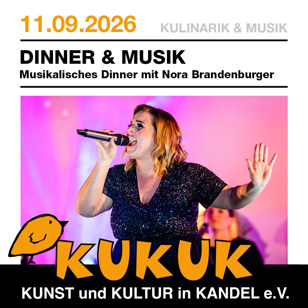 Erleben Sie einen unvergesslichen Abend mit einem exquisiten 4-Gänge-Menü, begleitet durch die Queen der musikalischen Vielfältigkeit Nora Brandenburger. Freuen Sie sich auf sorgfältig komponierte Speisen, die jeden Gang zu einem besonderen Geschmackserlebnis machen, während Nora Brandenburger mit ihrer einzigartigen Klangwelt für eine atmosphärische Begleitung sorgt. Nora Brandenburger ist mutig, souverän, stimmgewaltig.