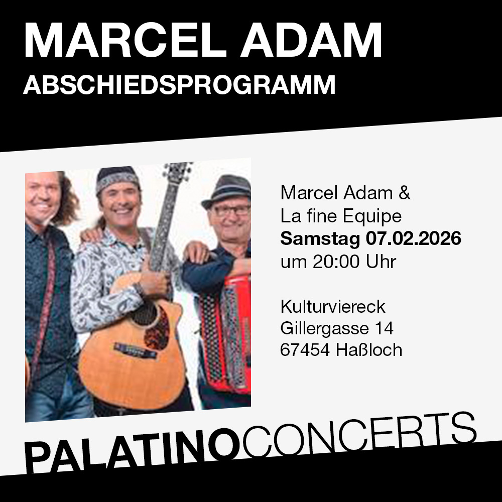 Er gilt als einer der bekanntesten Chansonniers und Liedermacher: Marcel Adam verzaubert mit seinen vom Leben geprägten Texten und Melodien schon seit über 30 Jahren seine Zuhörer. In seinen Liedern vermittelt er so viel Humor und Gefühl, dass sich niemand diesem Zauber entziehen kann. So spielt er seine beliebten Konzerte in Deutschland und Frankreich vor einer stetig wachsenden Fangemeinde und begeistert mit eigenen Liedern und Interpretationen von Piaf über Moustaki und Rühmann bis hin zu Nena.