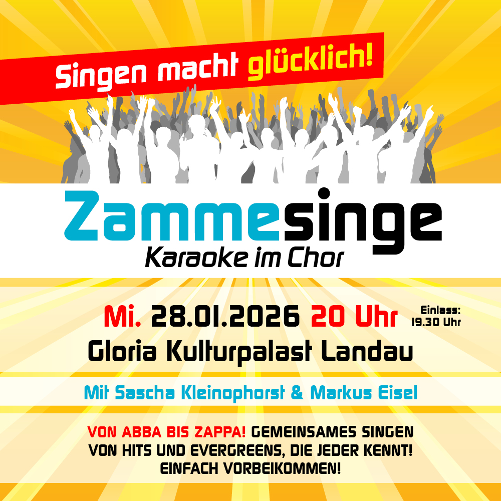 „Zammesinge“ heißt: Musikbegeisterte Menschen treffen sich mit Gleichgesinnten zum gemeinsamen Singen in entspannter Atmosphäre. Das Repertoire besteht aus Titeln aller Stilrichtungen, die jeder kennt. Als musikalische Begleitung gibt es mit Markus Eisel und Sascha Kleinophorst zwei Musiker, die das Ganze leiten und begleiten.